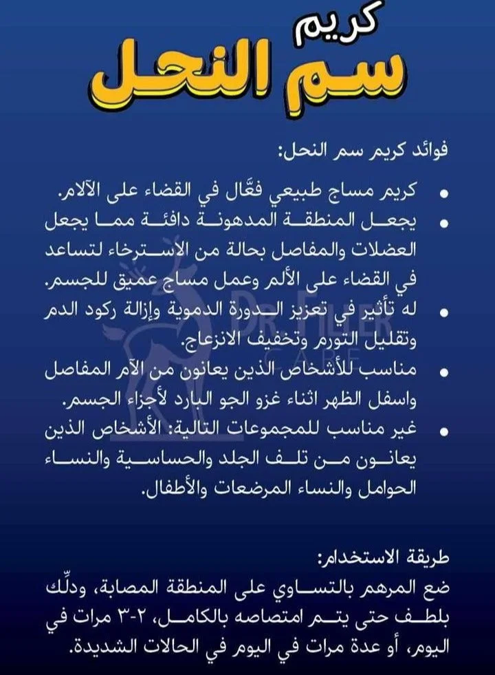كريم سمّ الركبة يساعد على تخفيف الألم بسرعة ويمنحك إحساس بالراحة والدفا، مناسب للركبة والظهر والمفاصل.